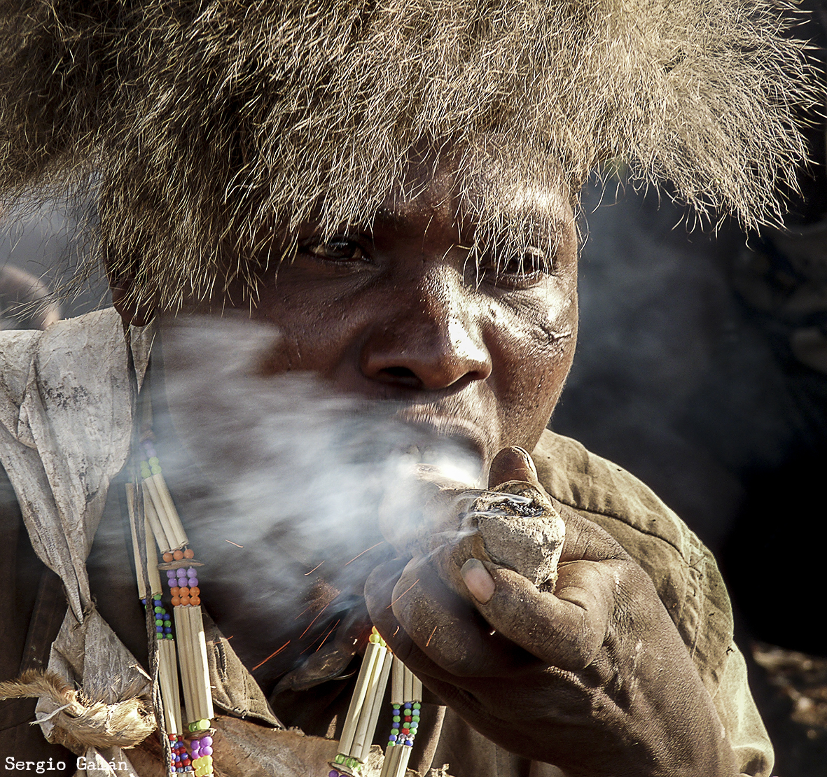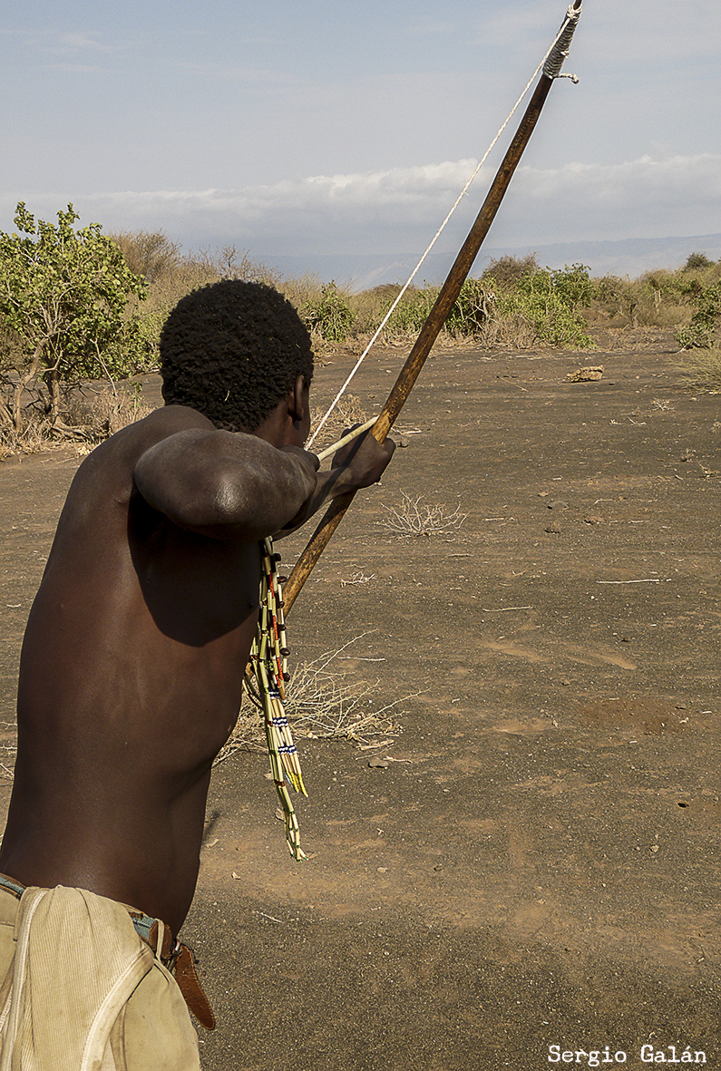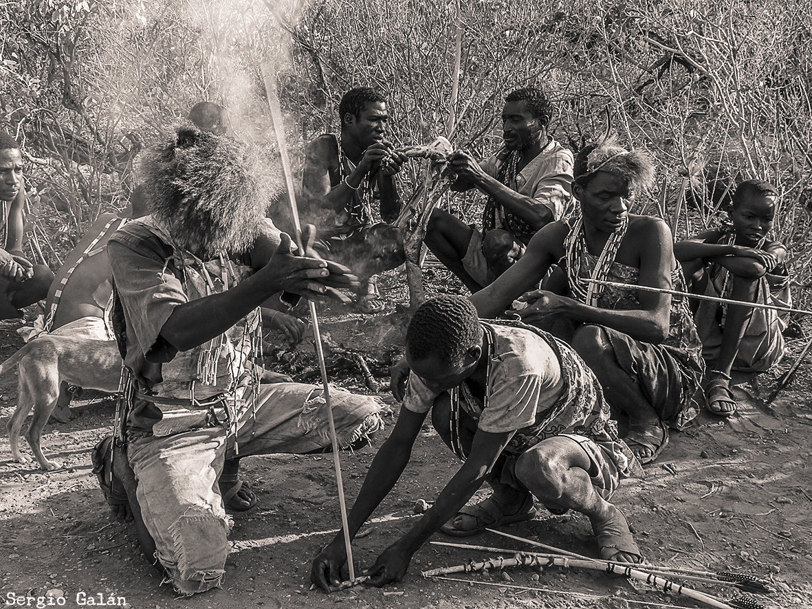 Los Hadzabe son una etnia que habita actualmente en el norte de Tanzania, en los alrededores del Lago Eyasi. Es característico su lenguaje mediante chasquidos que delata su origen bosquimano. Son cazadores-recolectores principalmente. Viven en un sitio desolador. La mitad del año amenazado de sequía y la otra mitad por inundaciones. Habitan este infierno no por gusto. Provienen de sitios más confortables. Pero el argumento de la violencia de otras etnias los convenció para que se mudaran. Cuando los conocí, en 2009, padecían una época de sequía. El lago estaba seco. Por completo. La tierra mostraba el cuarteado típico del telediario. En esta llanura polvorienta, para beber, exprimían raíces bulbosas que arrancaban de las entrañas de la tierra. Gota a gota, el agua fluía lentamente, densa, arrastrando el polvo de sus dedos hasta acabar sobre sus lenguas acartonadas, sin nunca llegar a paliar con plenitud la sed.